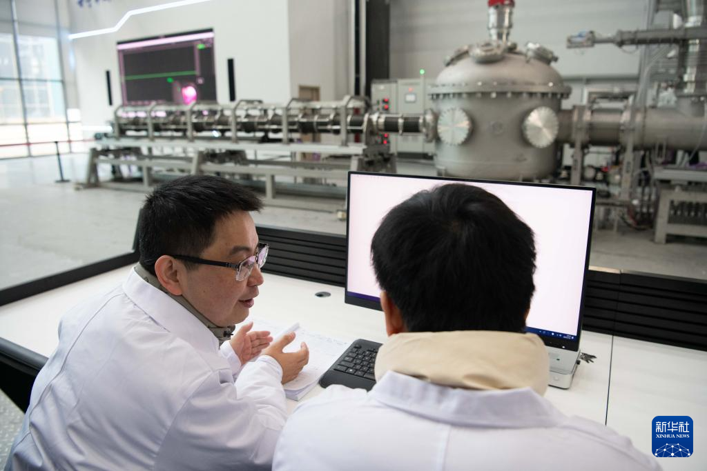 1月14日,在位于安徽省合肥市的聚变堆主机关键系统综合研究设施(CRAFT)园区内,科研人员在强流直线等离子体装置“赤霄”前进行交流。新华社记者 张端 摄