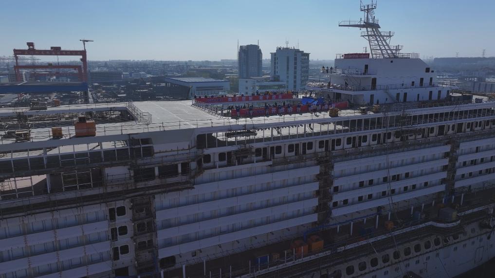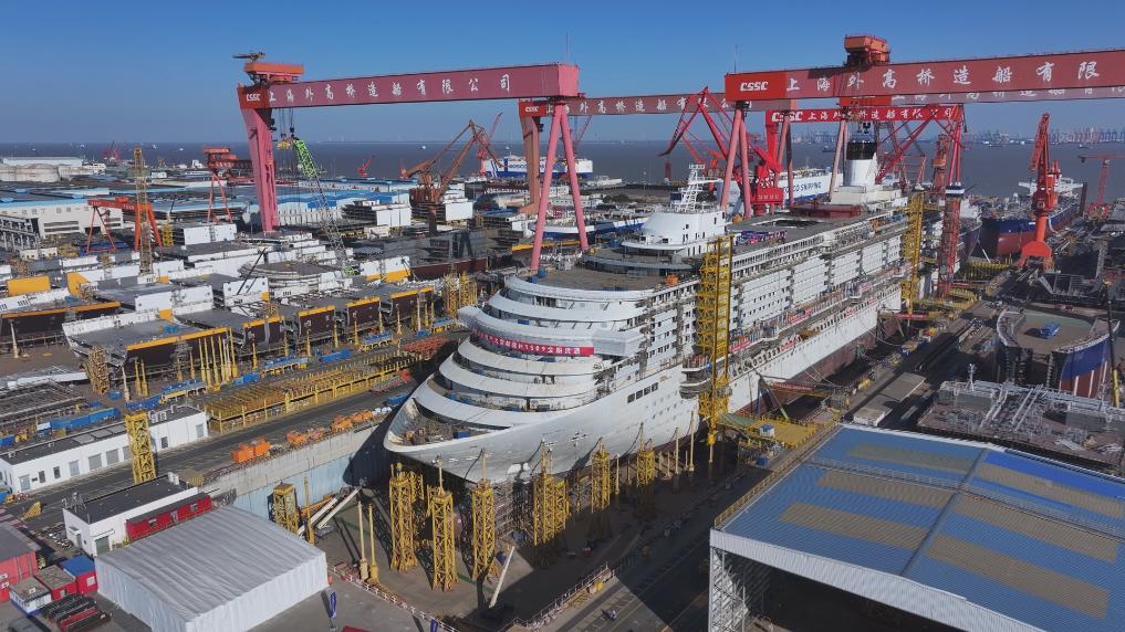 1月15日,第二艘国产大型邮轮“爱达·花城号”在中国船舶集团有限公司旗下上海外高桥造船有限公司2号船坞内实现全船贯通,从入坞总装搭载到全船贯通,仅用时不到9个月,较首制船“爱达·魔都号”缩短了2个多月。