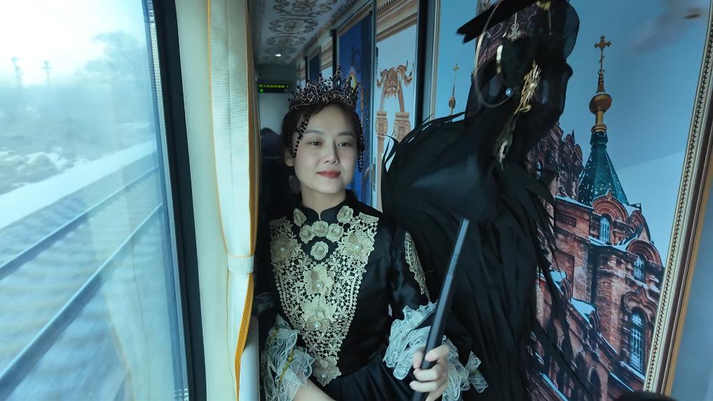 东北特色大花袄、魔法袍、公主风裙装……更衣室内,各式服装配饰一应俱全,车厢的壁纸还设计了哈尔滨街景、欧式风情、冰雪奇遇等主题场景,满足旅客的不同需求。