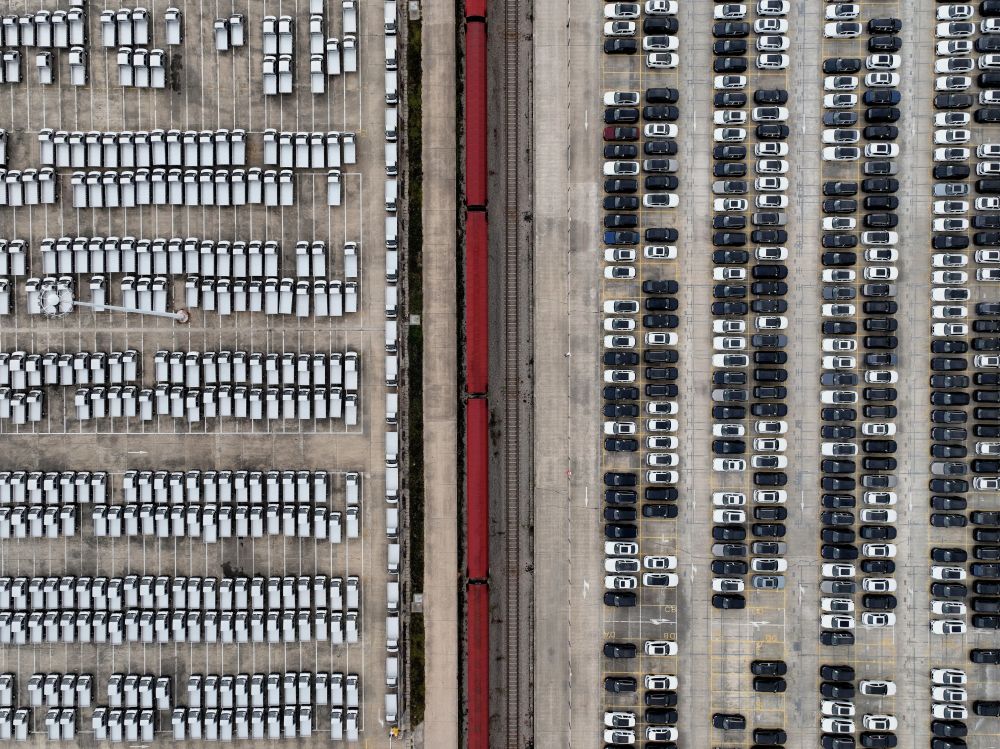 这是在中铁联集武汉中心站拍摄的整装待发的汽车(2024年11月16日摄,无人机照片)。新华社记者 邢广利 摄