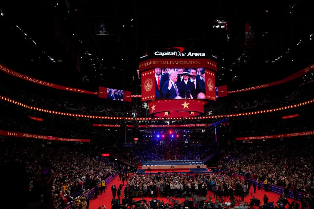1月20日,在美国首都华盛顿第一资本体育馆,人们观看美国第47任总统就职典礼的转播。新华社记者 吴晓凌 摄