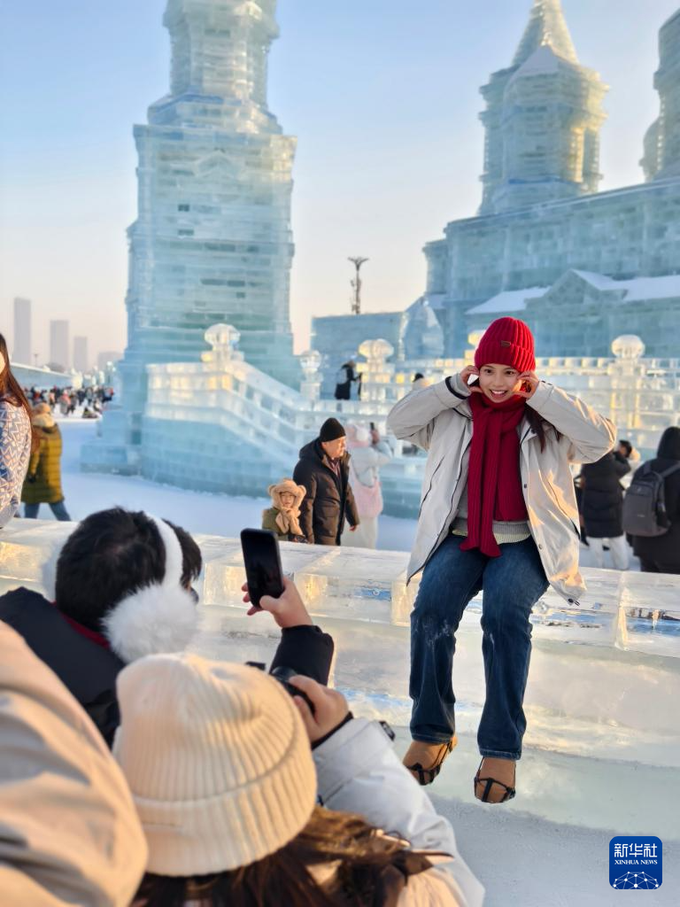 1月17日,台湾青年在哈尔滨冰雪大世界拍照。新华社发