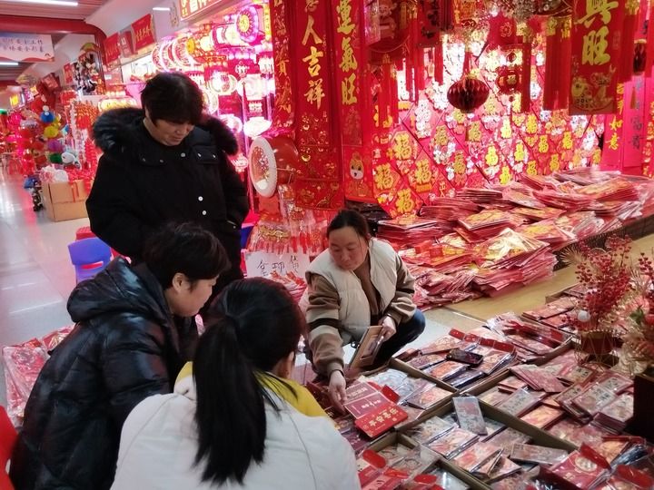 2024年12月23日,义乌国际商贸城一区一家售卖年画对联的店铺内,采购商正在选择红包款式,为即将到来的销售高峰补货。新华社记者屈婷 摄