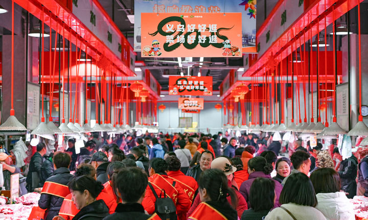 年货的最“刚需”——年饰,八成来自义乌。漫步在义乌国际商贸城那些纵横交错的通道里,年画、对联、挂历、灯笼、中国结、红包、电子鞭炮……汇成一片红色海洋。