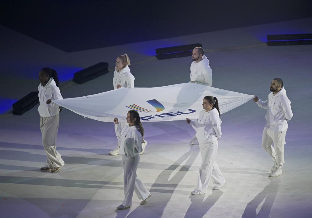 1月13日,国际大体联会旗在开幕式上入场。当日,第32届世界大学生冬季运动会开幕式在意大利都灵举行。新华社记者 贺灿铃 摄
