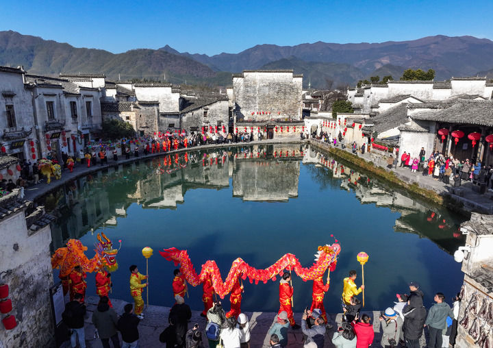 2025年1月18日,民俗表演队在安徽省黄山市黟县宏村巡游(无人机照片)。新华社发(施亚磊 摄)