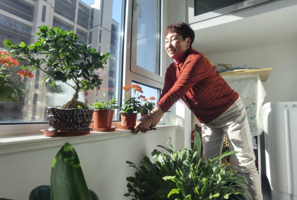 王训华在新家阳台收拾盆栽植物。新华社记者王凯 摄