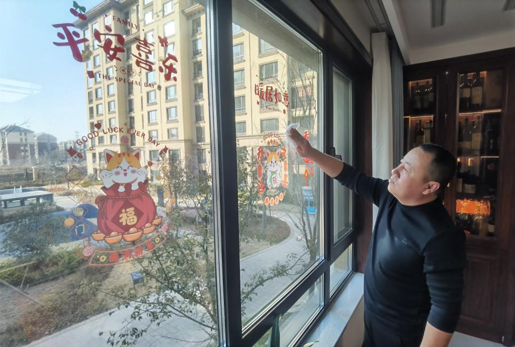 吴元胜在新家擦玻璃。新华社记者王凯 摄