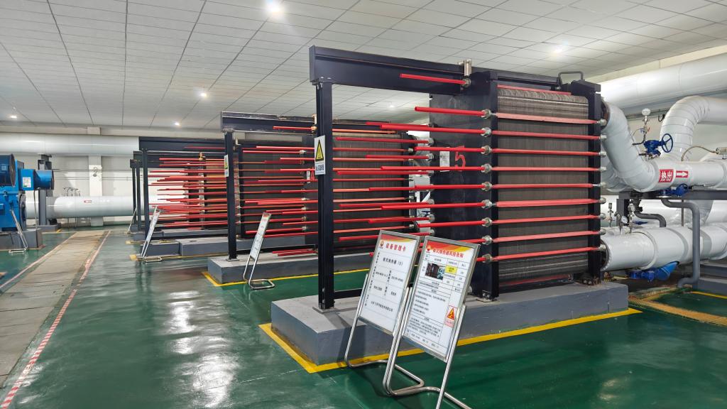 山东德州武城县地热集中供暖的换热泵房,从地下汲取的地热水正在换热器中进行换热作业。新华社记者萧海川 摄