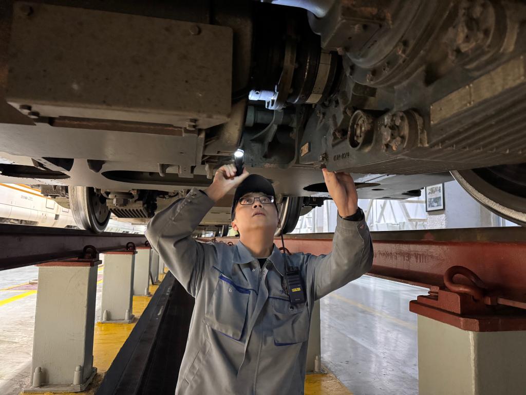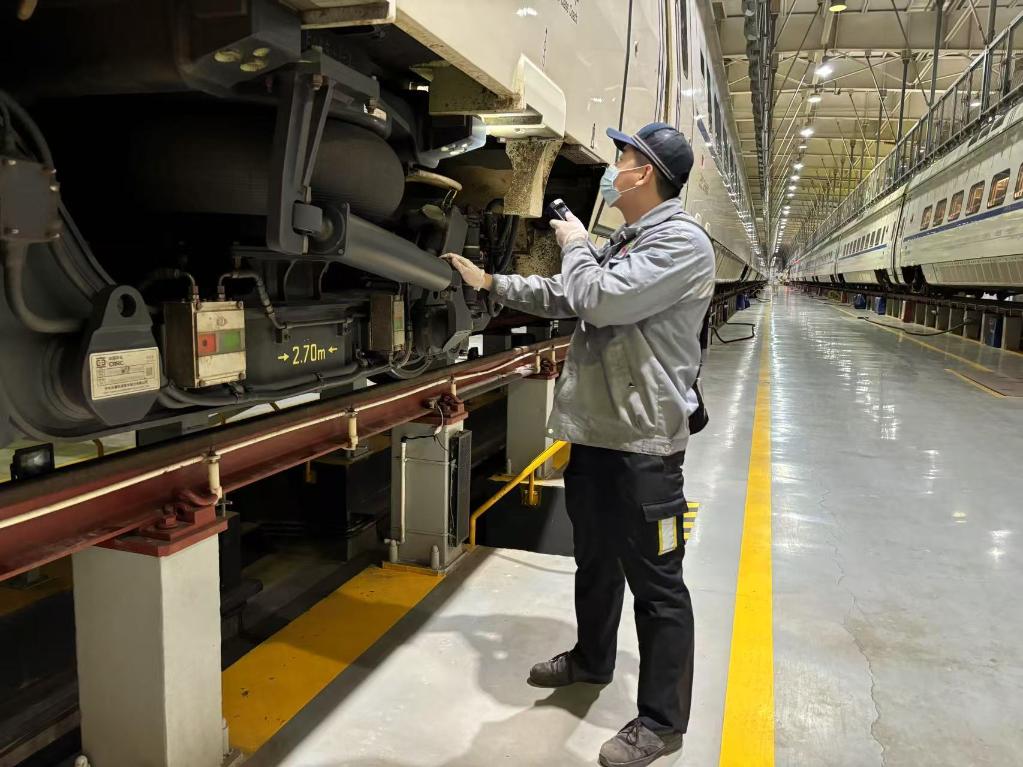 “检修1列8车厢固定编组的动车组列车需要4小时左右,其中车底检修作业一般用约1小时。”肖鹏对记者说,“相较于车顶和车内,在车底的工作更辛苦,要能承受长时间一个动作的考验。”