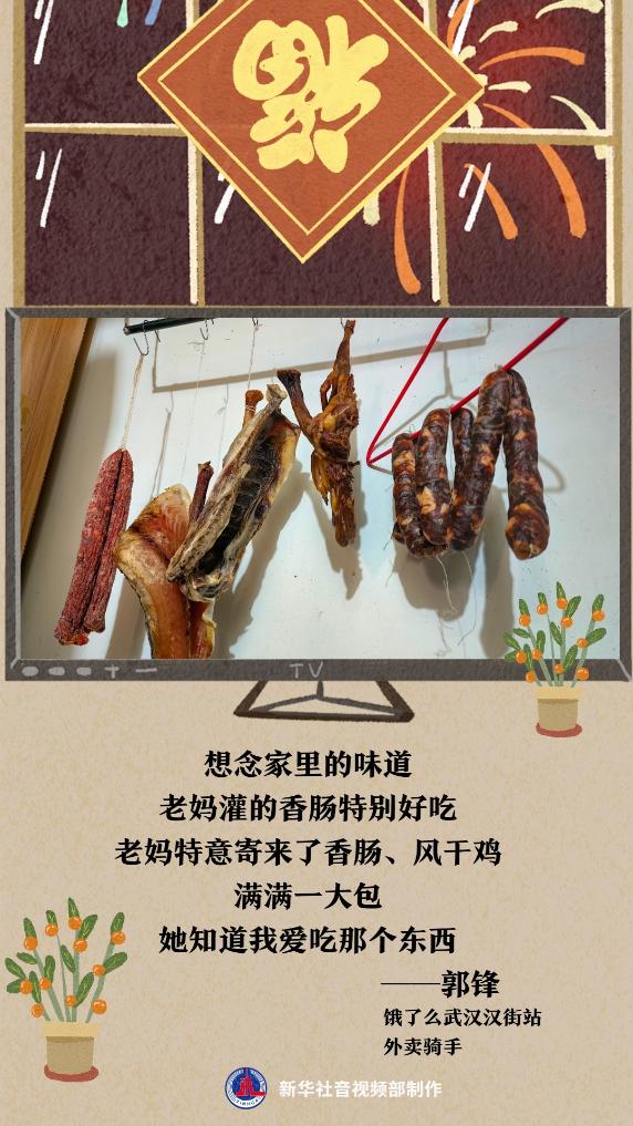 在武汉做外卖骑手的郭锋今年春节选择留守。为此,母亲特意寄来家乡特产,让在外过年的郭锋感受到家的味道。