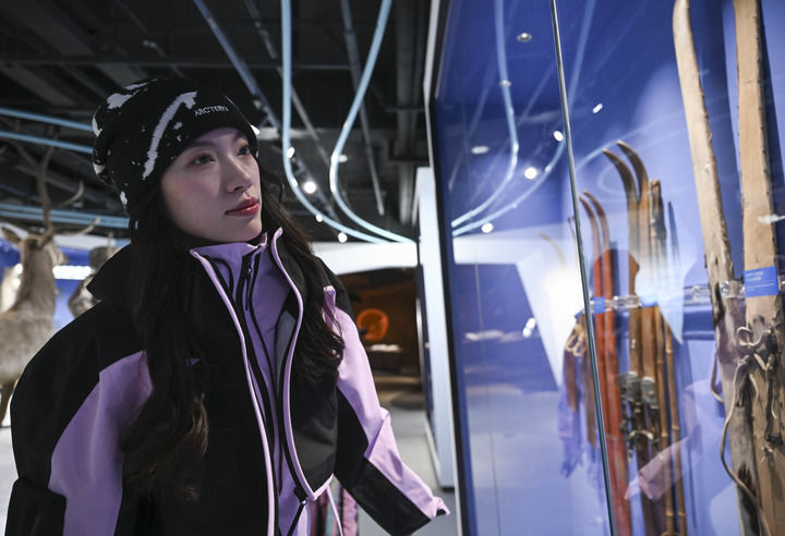 游客在位于阿勒泰将军山国际滑雪度假区的人类滑雪起源地博物馆参观(2025年1月28日摄)。新华社记者 胡虎虎 摄