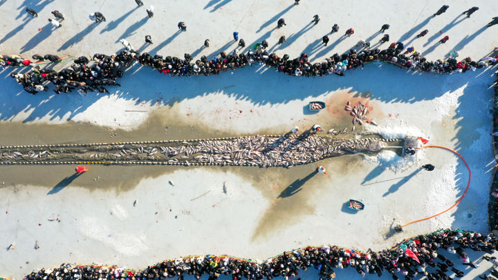 一眼望不到边的查干湖冰面上,口喷热气的马匹拖动绞盘,2000米长的渔网被从湖水中拖出,一条条肥硕的湖鱼在冰上摇头摆尾,捕鱼人露出收获的笑容,围观游客发出阵阵惊叹与喝彩。