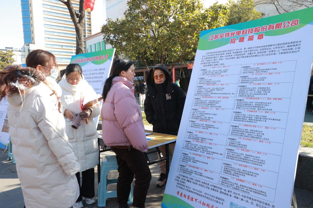 1月27日,江苏省淮安市盱眙县“2025年春风行动”招聘会现场,求职者在江苏宇特光电科技股份有限公司招聘处查看岗位信息。(受访者供图)