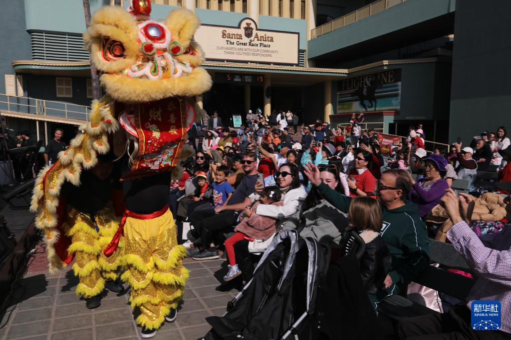 2月1日, 演员在美国阿卡迪亚市举行的春节庆祝活动上表演舞狮。新华社发(邱晨摄)
