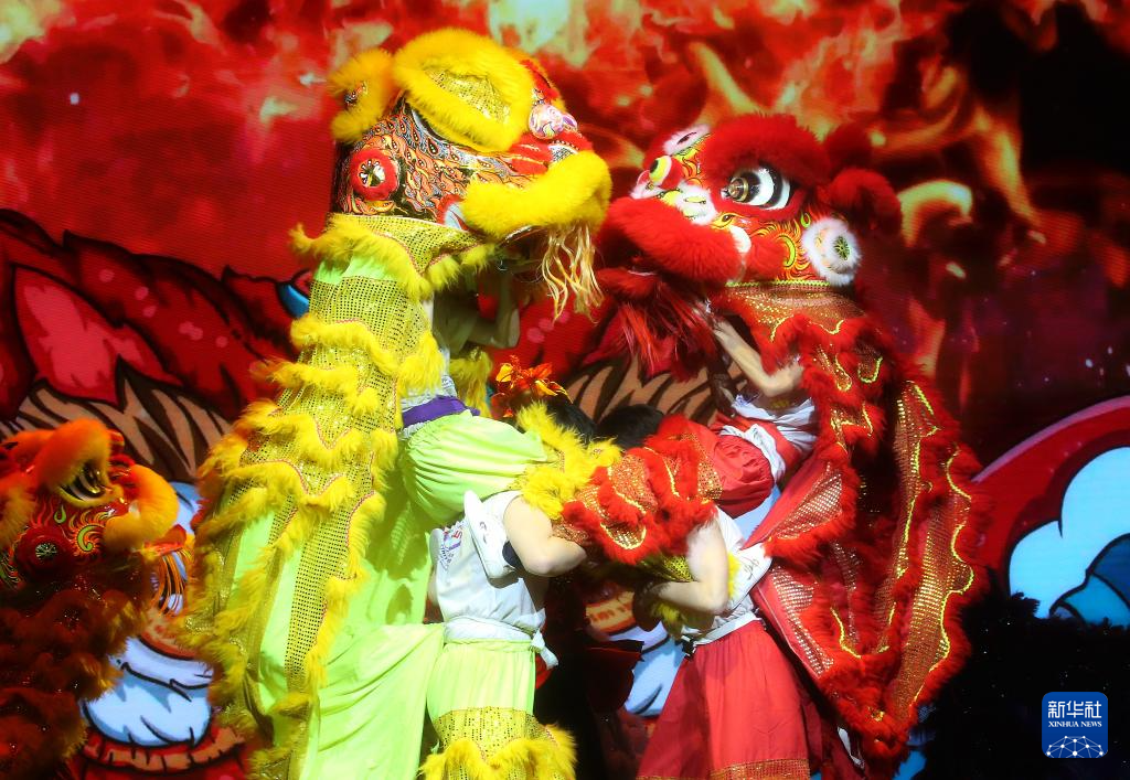 这是1月20日在白俄罗斯首都明斯克拍摄的中白学生春节联欢晚会上的舞狮表演。新华社发(任科夫摄)