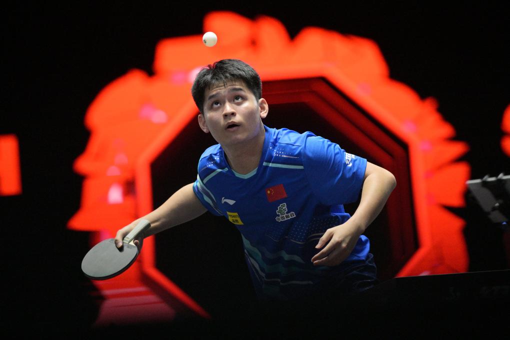 2月3日,林诗栋在世界乒乓球职业大联盟(WTT)新加坡大满贯男单第一轮比赛中发球。新华社发(邓智炜摄)