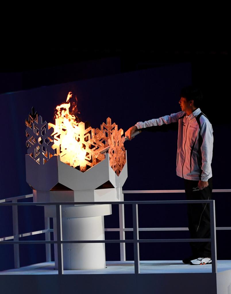 2017年2月19日,火炬手原田雅彦点燃主火炬。当日,第八届亚洲冬季运动会在日本札幌市开幕。 新华社记者 贺长山 摄
