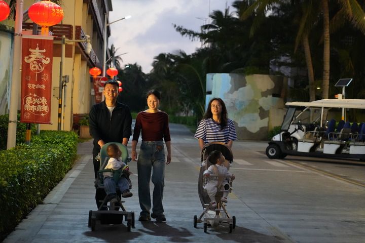1月24日,在永兴岛上,人们一起散步享受团圆时刻。