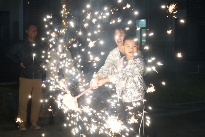 1月28日除夕夜的晋卿岛,父母带着孩子一同放烟花守岁。