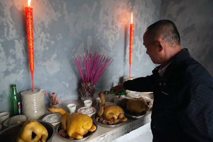 1月28日除夕这天,渔民在晋卿岛兄弟公庙祭拜。