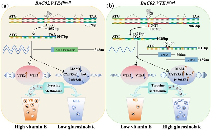 为此,研究团队利用全基因组关联分析在甘蓝型油菜群体中检测到与维生素E含量相关的主效QTL-qVE.C02,并通过遗传互补、定点诱变等技术手段克隆出该QTL的目标基因BnaC02.VTE4,发现BnaC02.VTE4第二个内含子其中一个剪接位点上A到G的碱基变异是导致油菜籽维生素E和硫苷含量差异的直接原因。研究团队进一步通过转录组和代谢组联合分析,阐明了维生素E和硫苷生物合成通路对底物的竞争关系,揭示了正向调控油菜籽维生素E和负向调控油菜籽硫苷含量的分子机制。