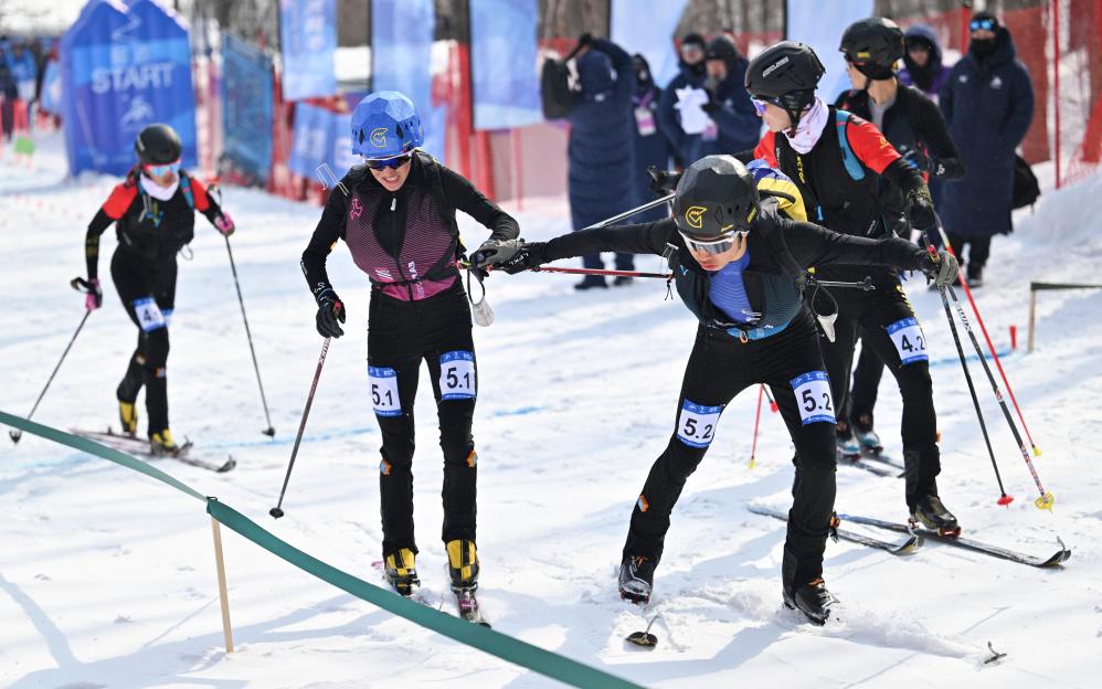 2月12日,次旦玉珍(前左)/布鲁尔在比赛中交接棒。当日,第九届亚冬会滑雪登山混合接力决赛在亚布力举行。中国组合次旦玉珍/布鲁尔、于婧萱/毕禹新、索朗曲珍/刘建宾分别获得冠、亚、季军。新华社记者 谢剑飞 摄
