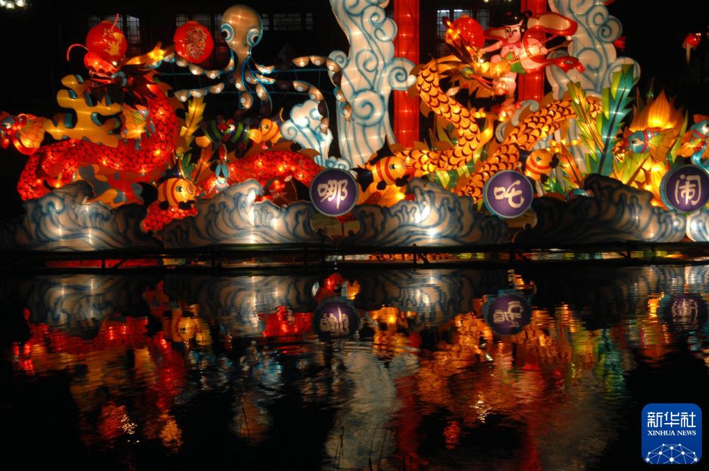 这是山东济南趵突泉公园内的“哪吒闹海”花灯(2012年2月4日摄)。新华社记者 郭绪雷 摄