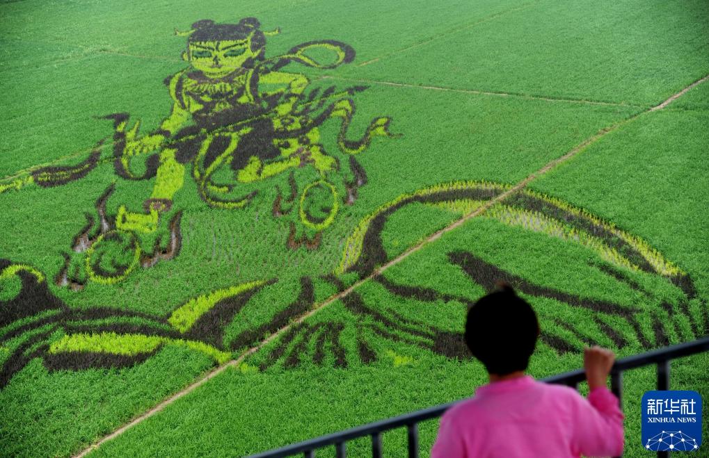 2014年7月1日,一位参观者在沈阳沈北新区兴隆台锡伯族镇欣赏名为《哪吒闹海》的巨型稻田画。新华社发(张文魁摄)