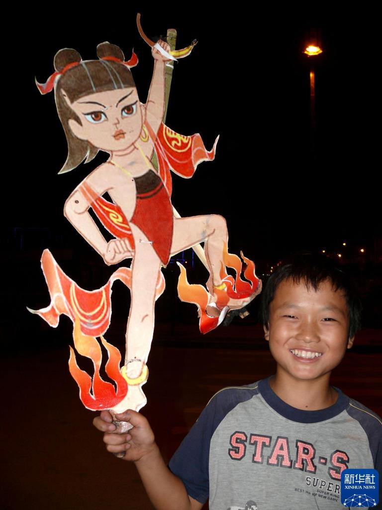 2009年9月26日,贵州印江的一名少年展示“焰火架”中的哪吒造型。印江土家族“焰火架”的制作传统已有500多年历史,经常在民俗活动中燃放。新华社发(陈晓岚摄)