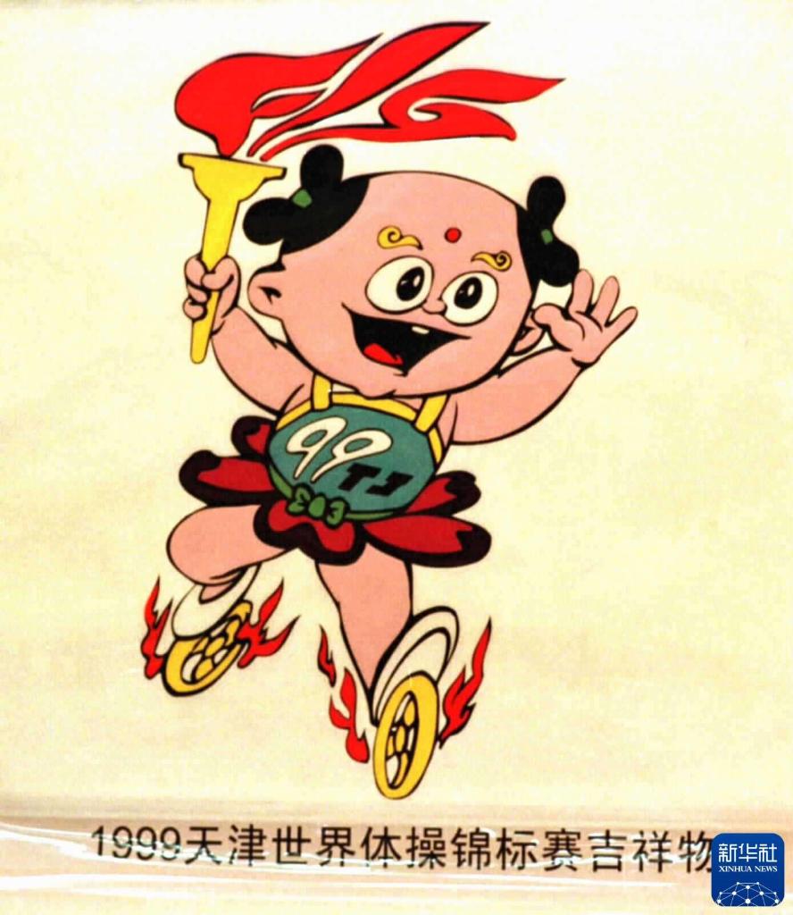 1999年天津世界体操锦标赛吉祥物是手擎火炬、脚踏风火轮的哪吒,火炬的火焰是“FIG”(国际体操联合会的英文缩写)的变形,哪吒的胸前有“99TJ”字样。 新华社发