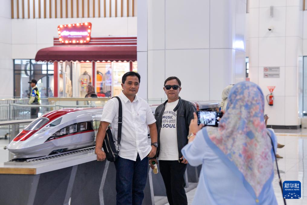 2月17日,在印度尼西亚雅加达,乘客在雅万高铁哈利姆站候车大厅与高速动车组模型合影。新华社记者 徐钦 摄