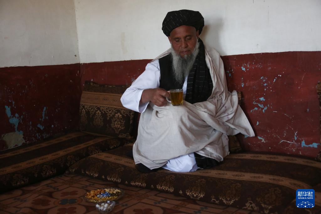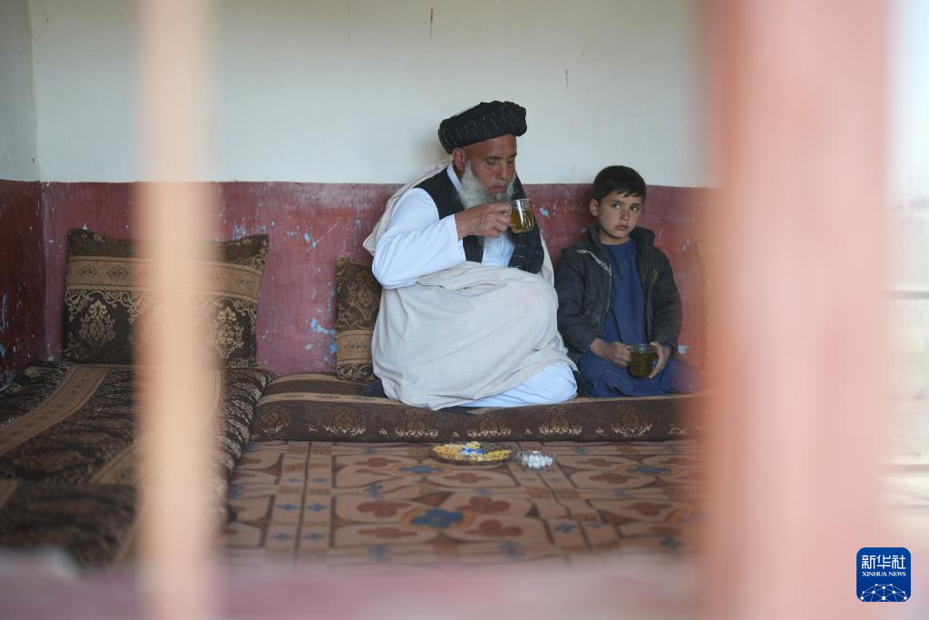 2月13日,在阿富汗贾拉拉巴德市附近的哈迪亚希尔,汗·穆罕默德在家中喝茶。新华社发(塞夫拉赫曼·萨菲摄)