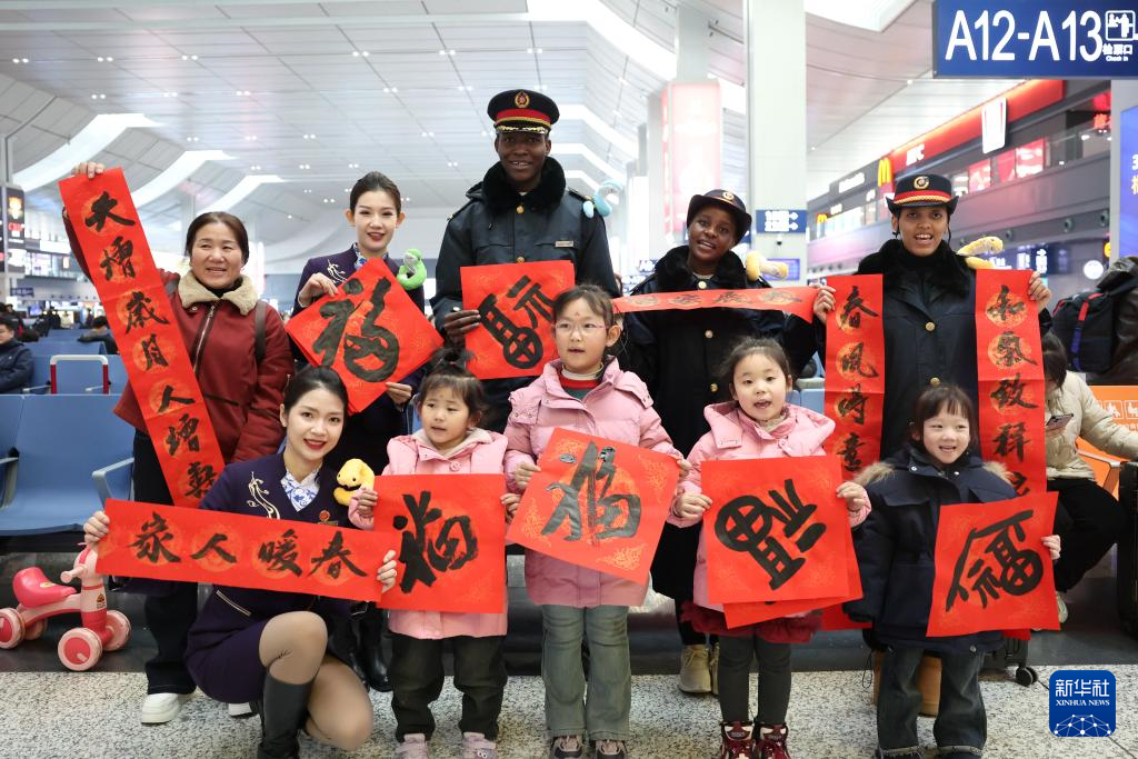 2025年1月18日,外国志愿者、铁路工作人员和旅客在兰州西站候车厅合影留念。新华社记者 陈斌 摄