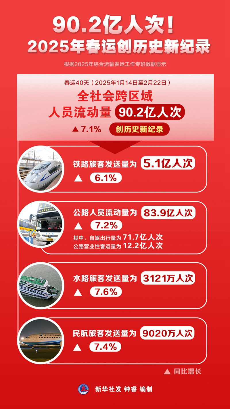 新华社北京2月23日电(记者叶昊鸣)记者23日从2025年综合运输春运工作专班获悉,根据专班数据,春运40天(2025年1月14日至2月22日),全社会跨区域人员流动量90.2亿人次,比2024年同期增长7.1%,创历史新纪录。