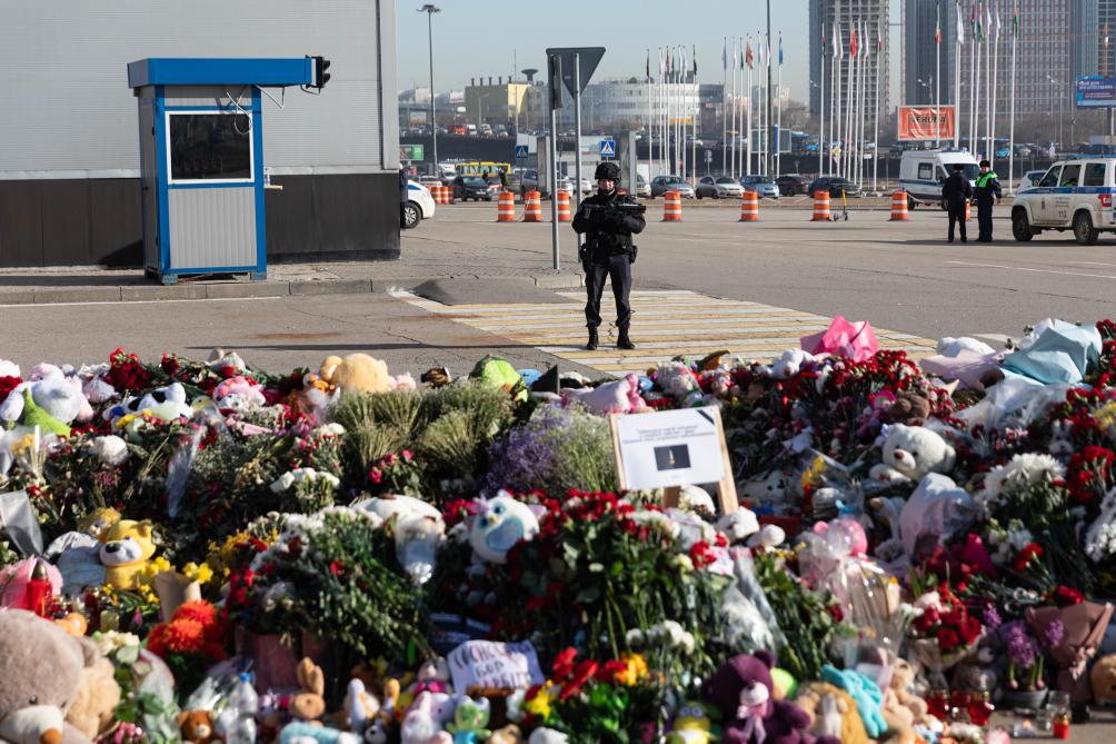 2024年3月22日晚,位于俄首都莫斯科近郊的“克罗库斯城”音乐厅发生严重恐袭事件,造成超过140人死亡、500多人受伤。3月24日全国哀悼日的晚上,细雨绵绵,民众献上的鲜花、玩具、蜡烛摆满整条街道,有人默默祈祷,有人痛哭失声。