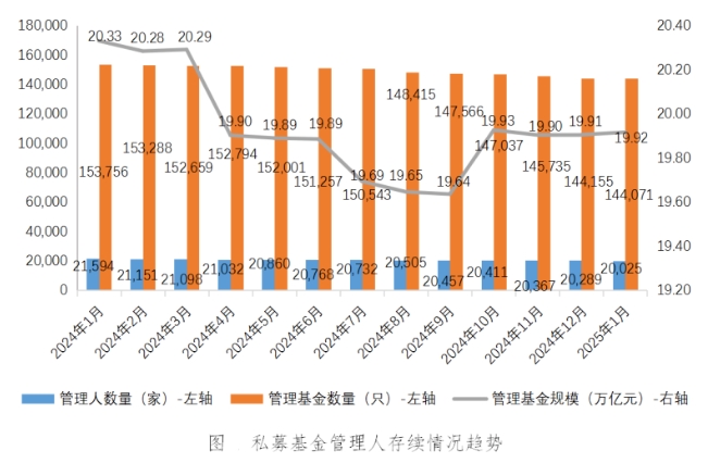 中国基金业协会最新发布的数据显示,截至2025年1月末,存续私募基金管理人20025家,管理基金数量144071只,管理基金规模19.92万亿元。