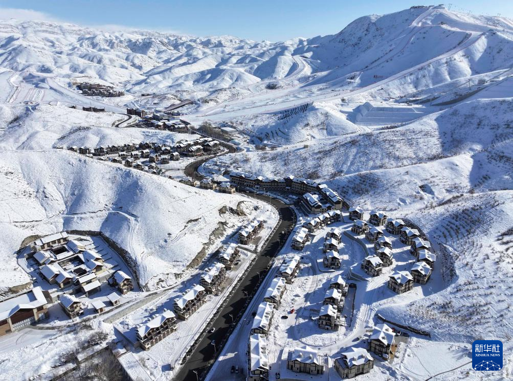 这是2025年1月24日拍摄的新疆阿勒泰将军山国际滑雪度假区周边的酒店民宿等商业建筑群(无人机照片)。新华社记者 胡虎虎 摄