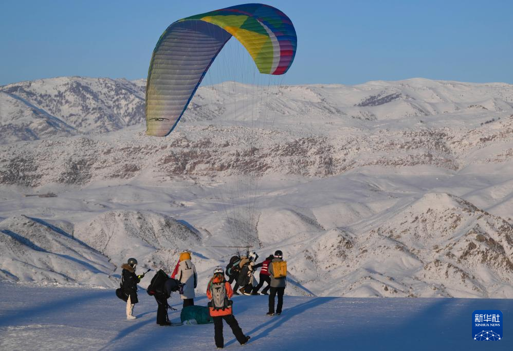 游客在新疆阿勒泰将军山国际滑雪度假区体验滑翔伞(2025年1月24日摄)。新华社记者 胡虎虎 摄