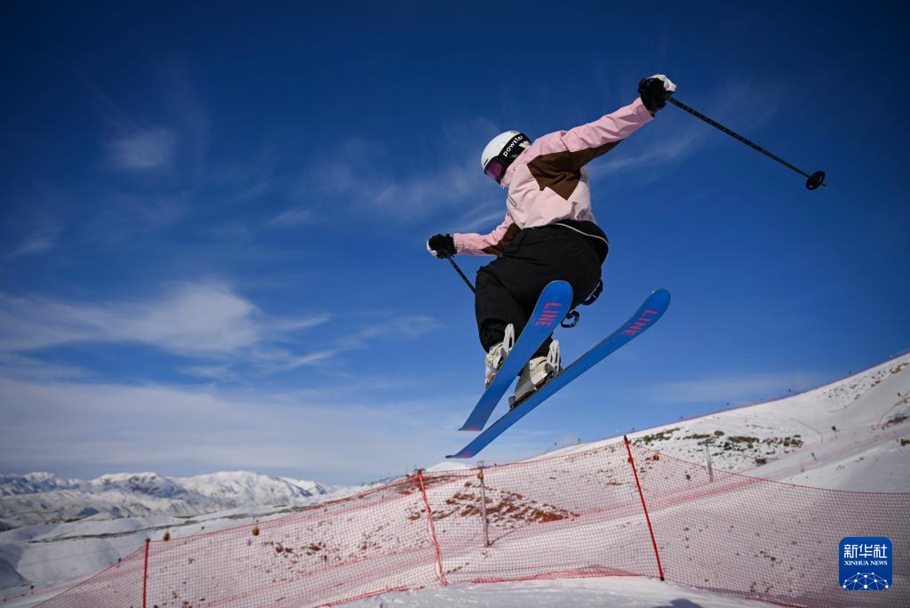 农历除夕当天,雪友在新疆阿勒泰将军山滑雪公园飞越跳台(1月28日摄)。新华社记者 胡虎虎 摄