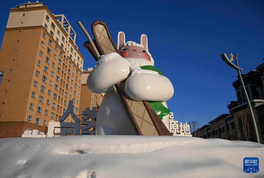 “雪怪阿乐”大型文创雕塑摆放在前往将军山国际滑雪度假区的路口(2025年1月24日摄)。新华社记者 胡虎虎 摄