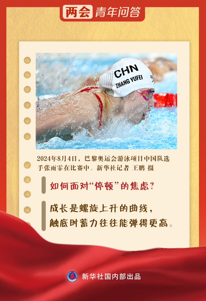 张雨霏:要坚持、不放弃。面对困境挑战,年轻人有时可能会犹豫纠结,但其实骨子里谁不想突破?巴黎奥运会后,我有一阵儿很想“躺平”,可“躺”了两个星期后,还是会振作起来做有意义的事,想让自己的人生更完美。我想大多数年轻人也是这种心态。