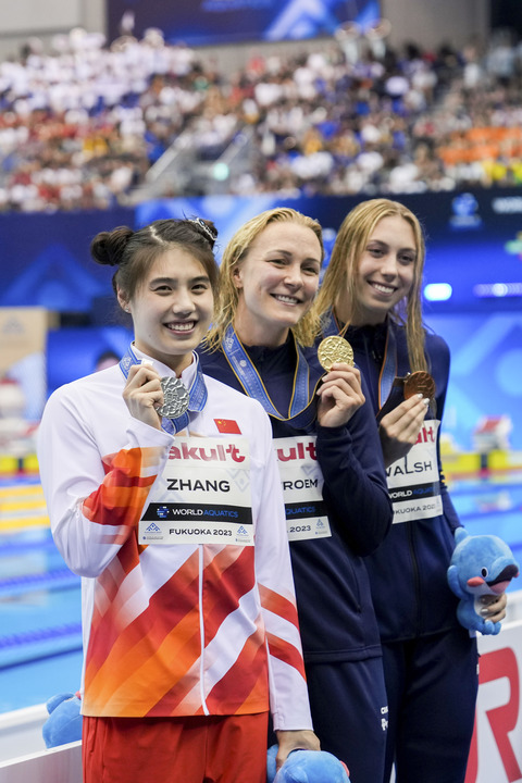 2023年7月29日,在日本福冈举行的2023年世界游泳锦标赛女子50米蝶泳决赛中,中国选手张雨霏(左一)以25秒05的成绩获得亚军,并打破该项目亚洲纪录。新华社记者 张笑宇 摄