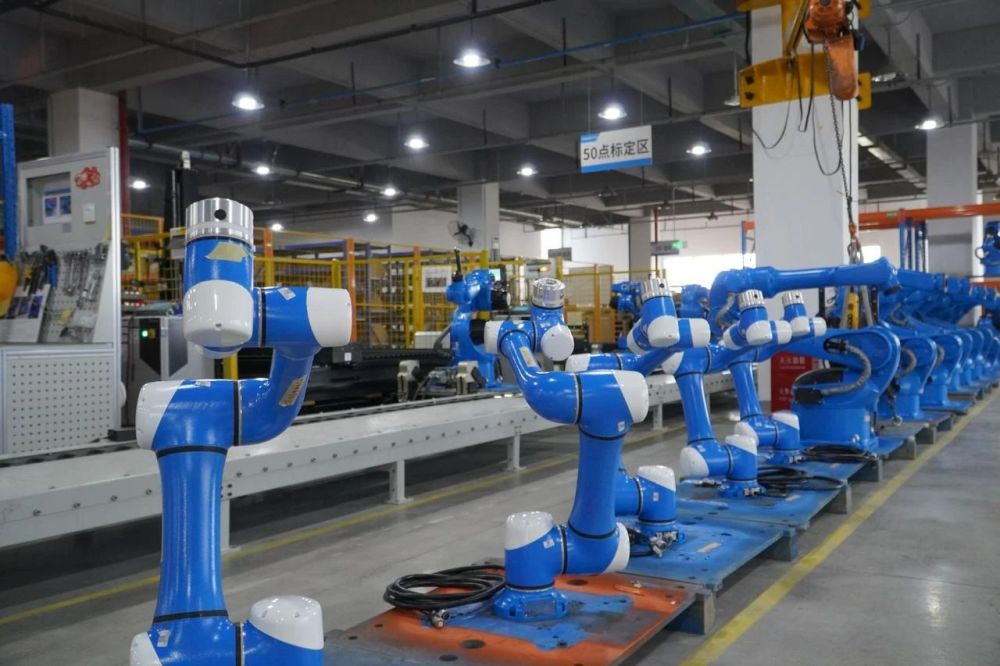 工厂一楼,一排排工业机器人的机械手臂正灵活地上下翻转,进行出厂前的测试。测试通过后,它们将被运往世界各地,应用在喷涂、焊接、搬运、汽车制造等多个领域。