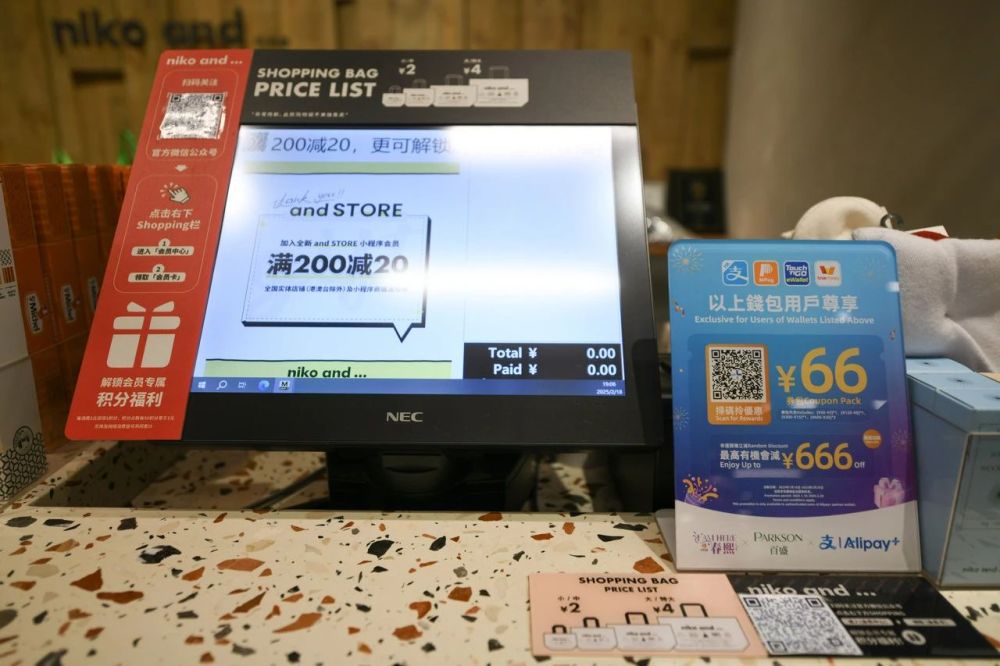 走进老牌商场时代百盛,最先看到的是时装品牌EPYAYING的新概念店,柜台上摆着便捷支付英文提示牌。