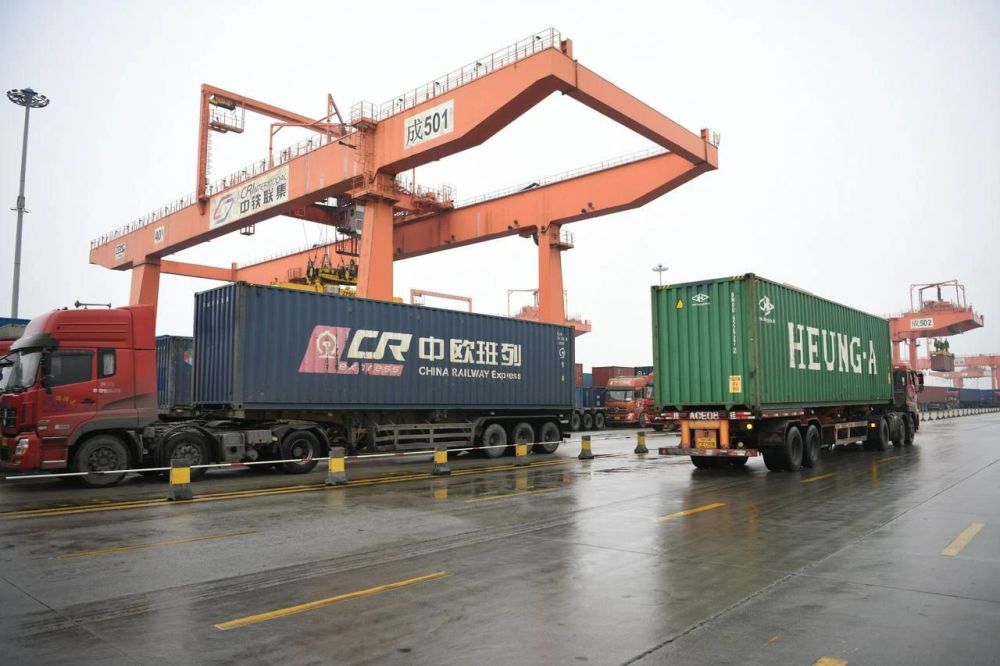 2月19日,装载中欧班列货箱的货车行驶在成都国际铁路港。新华每日电讯记者胥冰洁 摄