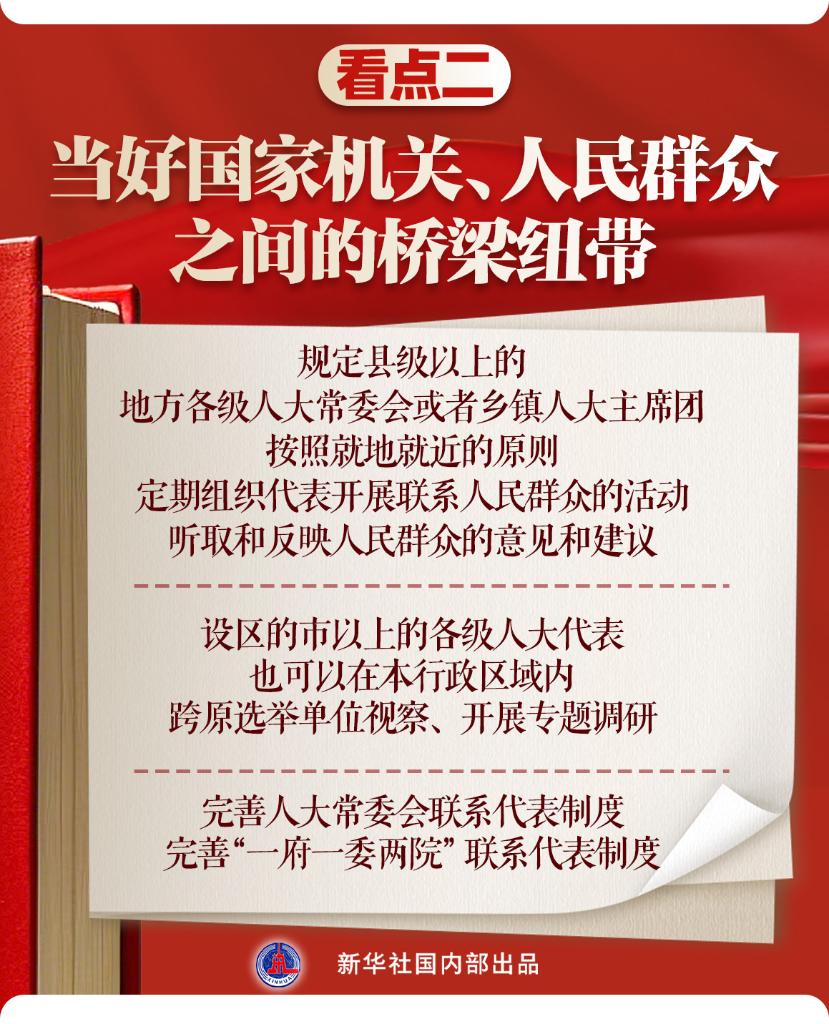 让国家机关与人大代表互动更“密”——代表法修正草案进一步完善人大常委会联系代表制度,完善“一府一委两院”联系代表制度。