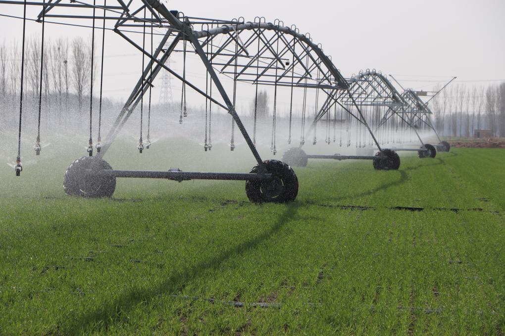 图为种粮大户使用自动喷灌设备给麦田浇水。(张静 摄)