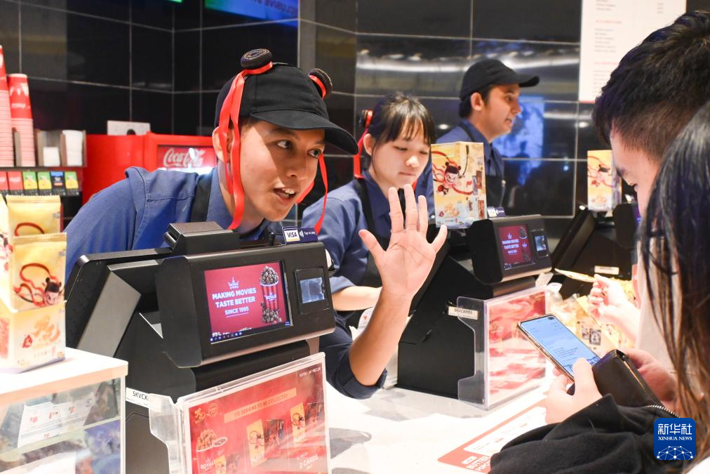 3月8日,在马来西亚吉隆坡,《哪吒之魔童闹海》首映现场的工作人员与观众互动。新华社记者 程一恒 摄