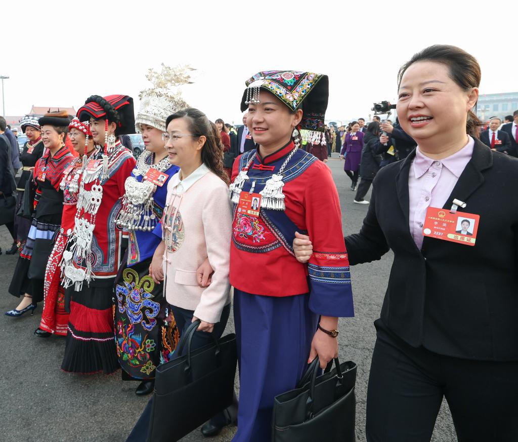 3月5日,卢丹(右二)和代表们一起走向人民大会堂。